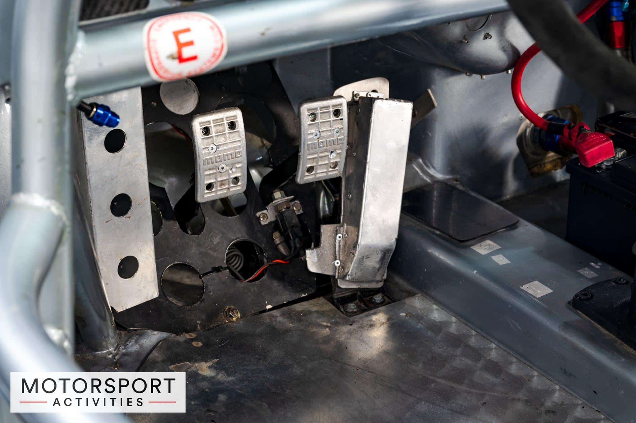 L’habitacle comprend une cage de sécurité soudée au châssis à plusieurs points, un siège baquet Tillett doté d’un harnais Sabelt, et une série d’interrupteurs pour les fonctions auxiliaires de la voiture, ainsi qu’un système de freinage réglable Tilton.