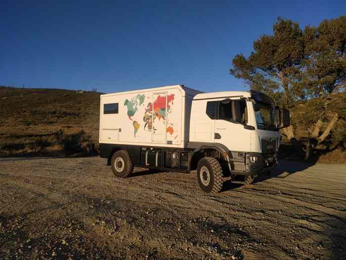 Grand camping-car MAN 13.290 Globe Camper à vendre, équipée d’une cellule Globe Explo 460, homologué pour 3 places et avec seulement 12 300 kilomètres au compteur. Ce modèle dispose de deux réservoirs de gasoil d’une capacité totale de 200 litres, idéal pour les longs trajets.