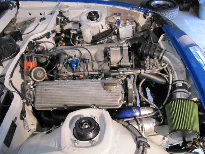 Le moteur est tout neuf avec des pistons forgés, des soupapes de gros diamètres, une pipe d’admission GTS, ainsi qu’un turbo KKK K26.