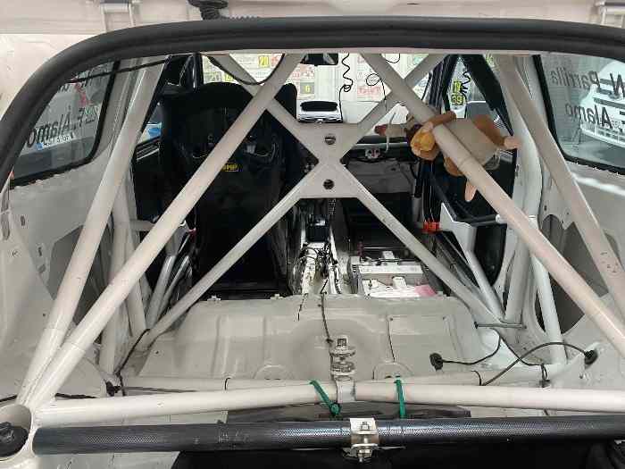 Pour ce qui est de l’intérieur, il est *habillé avec des panneaux de porte en carbono* et une pantalla central. La batterie de gel se trouve à l’intérieur. Comprend un freno de mano hidraulico et des barras identiques à celles du R3, jusqu’aux torretas. Installation de frein complète avec latiguillos de aviación. Actuellement, pas de baquets ni d’arçons, un est caducado. Système d’extinction en place (à revisar).